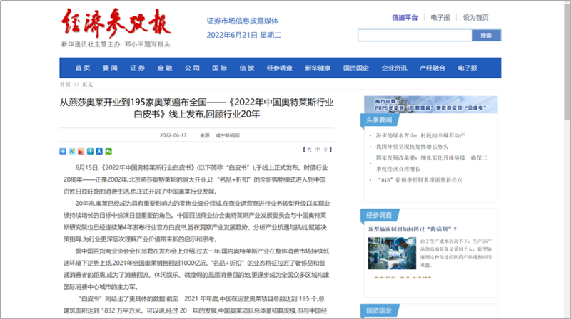 2022年6月15日,中國(guó)百貨商業(yè)協(xié)會(huì)奧特萊斯產(chǎn)業(yè)發(fā)展委員會(huì)線上直播發(fā)布《2022年中國(guó)奧特萊斯行業(yè)白皮書》。白皮書中“2021年中國(guó)零售市場(chǎng)最新發(fā)展、中國(guó)奧萊20年全覽、2021年中國(guó)奧萊市場(chǎng)發(fā)展、中國(guó)奧萊展望和政策建議、專家訪談”等內(nèi)容吸引政府領(lǐng)導(dǎo)、專業(yè)機(jī)構(gòu)、產(chǎn)業(yè)運(yùn)營(yíng)商、品牌商、服務(wù)商、媒體記者及眾多奧萊消費(fèi)者共計(jì)20余萬人參會(huì),成為國(guó)內(nèi)奧萊行業(yè)年度一大焦點(diǎn)。
