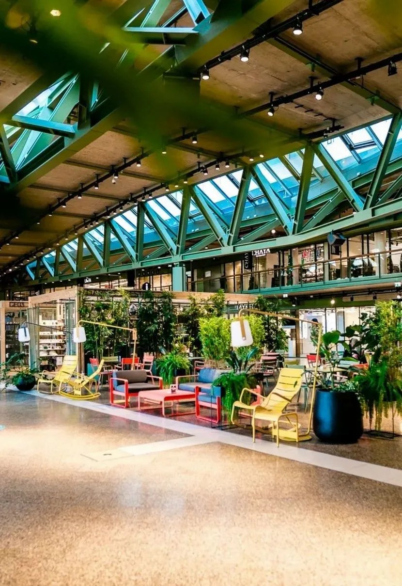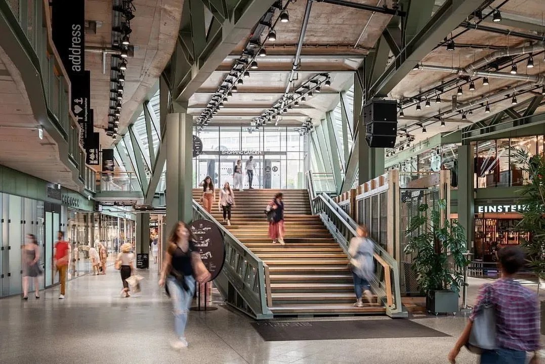 在商業(yè)的二層則設(shè)置了一個(gè)開放、通透的公共空間,同柏林潮流酒店25小時(shí)(Twenty five hours hotel)進(jìn)行聯(lián)通。并以城市綠洲為設(shè)計(jì)概念,在頂層設(shè)計(jì)了一個(gè)布滿植物盆栽的七千平方公尺的天臺,供給顧客休憩社交,營造自由、無拘束的商業(yè)氛圍,與項(xiàng)目的整體定位相得益彰。